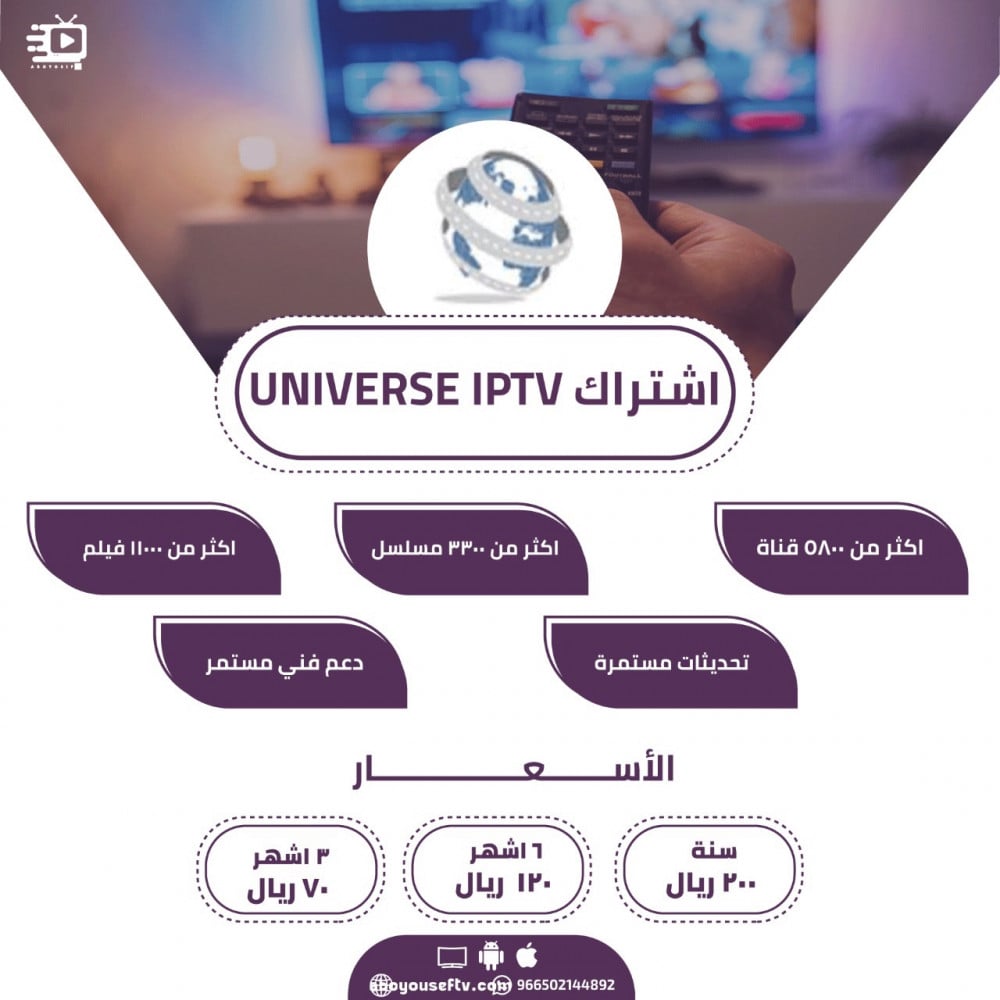 إذا كنت تبحث عن باقة تلفزيونية تضم كل ما تحب وترغب في مشاهدته، فأنت بحاجة إلى باقة يونيفيرس لمدة سنة. هذه الباقة توفر لك *5100 قناة* تغطي جميع المجالات والمواضيع، من الأخبار والرياضة والترفيه والثقافة والدين والتعليم والأطفال والموسيقى والأفلام والمسلسلات والوثائقيات والكوميديا والألعاب والمزيد. ستجد في باقة يونيفيرس قنوات بمختلف اللغات واللهجات والجودات، بالإضافة إلى خاصية الترجمة والتعليق الصوتي للقنوات التي لا تتوفر بلغتك. كما ستحصل على خاصية التسجيل والمشاهدة لاحقاً، وخاصية البث المباشر للقنوات عبر الإنترنت. ولكن هذا ليس كل شيء، فباقة يونيفيرس تمنحك أيضاً إمكانية الوصول إلى *11300 فيلم* و*3300 مسلسل* متجددة باستمرار، بحيث تتمكن من متابعة أحدث الإصدارات والحصريات والمفضلة لديك. ستتمتع بمشاهدة الأفلام والمسلسلات بجودة عالية وبدون إعلانات مزعجة. ستحصل أيضاً على توصيات شخصية تناسب اختياراتك وتفضيلاتك. كل هذا وأكثر بسعر رمزي سنوي. لا تتردد واشترك الآن في باقة يونيفيرس لمدة سنة، واستمتع بعالم من المشاهدة المتنوعة والممتعة. 😍